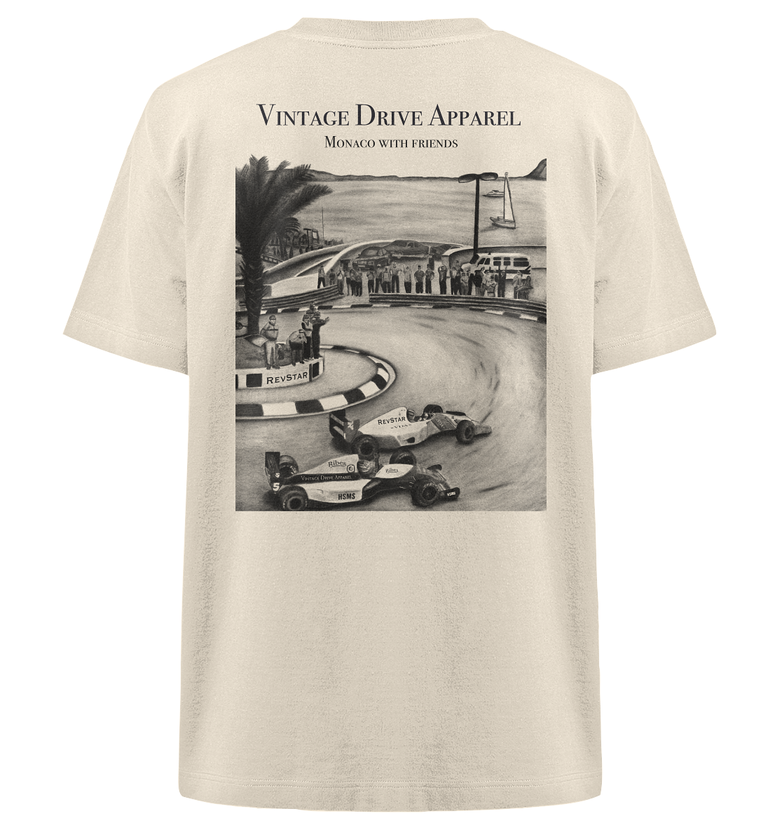 Dieses Oversized T-Shirt ist nicht nur ein stylisches Fashion-Statement, sondern auch eine Hommage an einen der denkwürdigsten Momente der Formel 1-Geschichte. Der auf der Vorderseite abgebildete ikonische Vintage Drive Apparel Schriftzug ergänzt das sorgfältig gestaltete Artwork, das den legendären Kampf zwischen Nigel Mansell und Ayrton Senna beim Großen Preis von Monte Carlo 1992 darstellt – ein Rennen, das Motorsportgeschichte schrieb. Die detailreiche Illustration fängt die Intensität und Dramatik des Rennens ein und macht dieses T-Shirt zu einem Must-Have für Motorsport-Fans und Vintage-Liebhaber