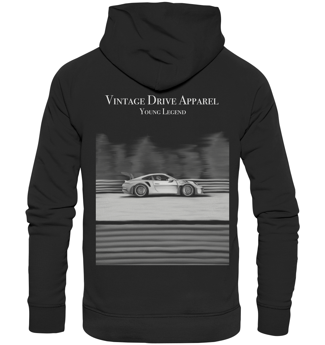 Dieser hochwertige Hoodie mit dem Titel „Young Legend“ ist eine Hommage an einen der modernsten und leistungsstärksten Sportwagen unserer Zeit. Auf der Rückseite prangt eine kunstvolle Illustration des Supersportwagens, die seine atemberaubende Aerodynamik und den kraftvollen Charakter eindrucksvoll zur Geltung bringt. Er ist bereits jetzt eine Ikone der modernen Automobilwelt und verleiht dem Hoodie einen markanten Look. Auf der Vorderseite rundet der dezente Vintage Drive Apparel Schriftzug das Design stilvoll ab und macht den Hoodie zu einem zeitlosen Must-Have für Auto- und Motorsport-Liebhaber.